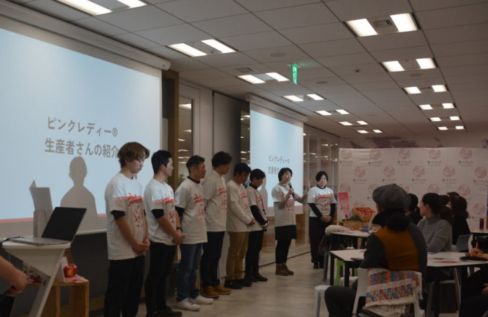 ピンクレディー®の生産者は全国でたった48名。そのうち8名の生産者さんが、青森・長野から集まりました。青森の生産者さんは、なんと朝4時半起き。大雪の中、都内まで駆け付けました。