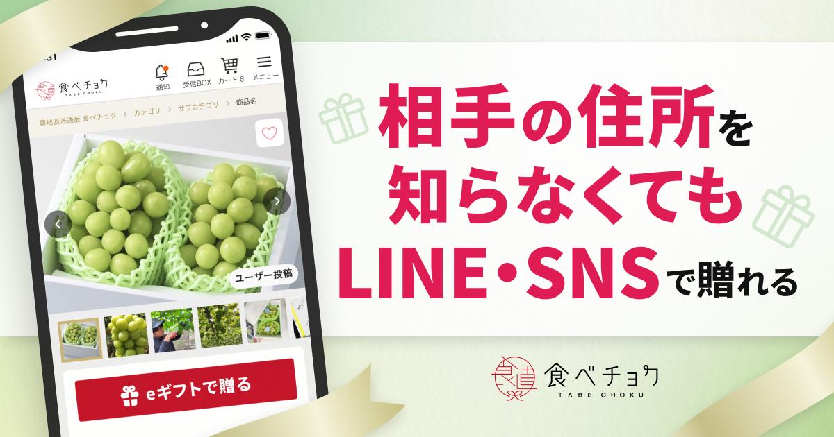 食べチョクでは、住所を知らない相手にもLINEやSNSなどで「ありがとう」「おめでとう」の気持ちといっしょに気軽に贈りものができる「eギフト機能」をご用意しています。