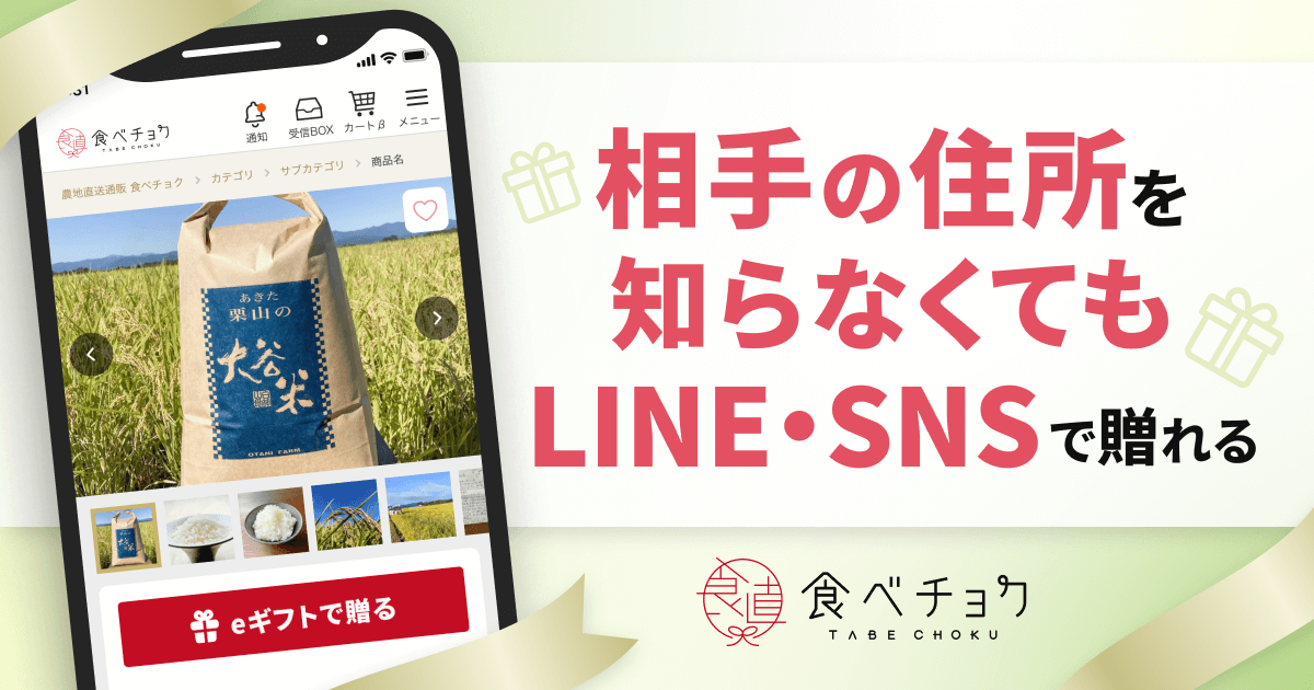 食べチョクでは、住所を知らない相手にもLINEやSNSなどで「ありがとう」「おめでとう」の気持ちといっしょに気軽に贈りものができる「eギフト機能」をご用意しています。