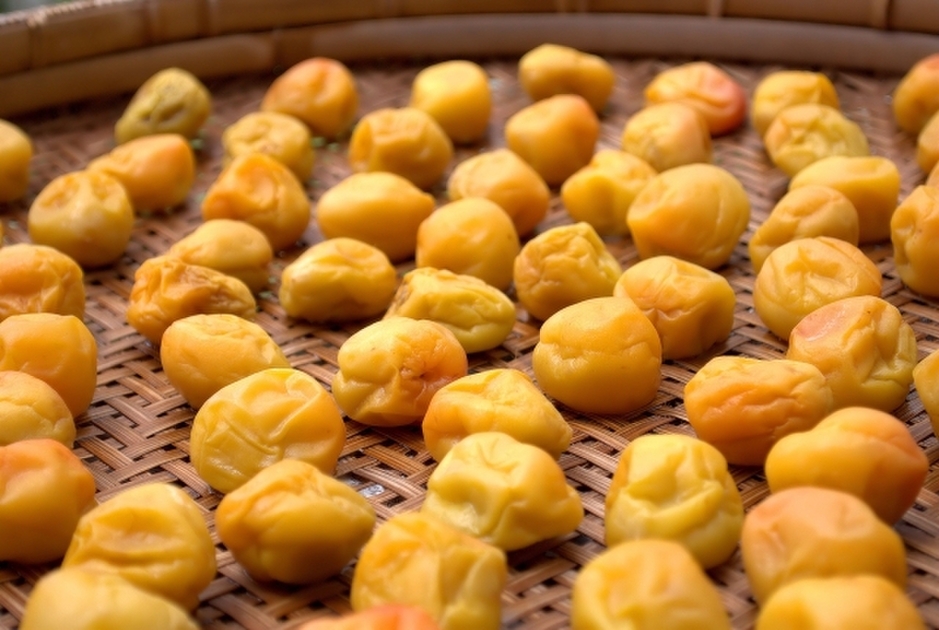 ※土用とは立秋(8月8日頃)の18日間です。梅雨明けをしていない地域は梅雨が明けるまで待ちます。三日三晩、晴れ予報の日を確認して梅をザルに上げて天日に干す。朝晩天地返しをして、まんべんなく梅に天日をあてる