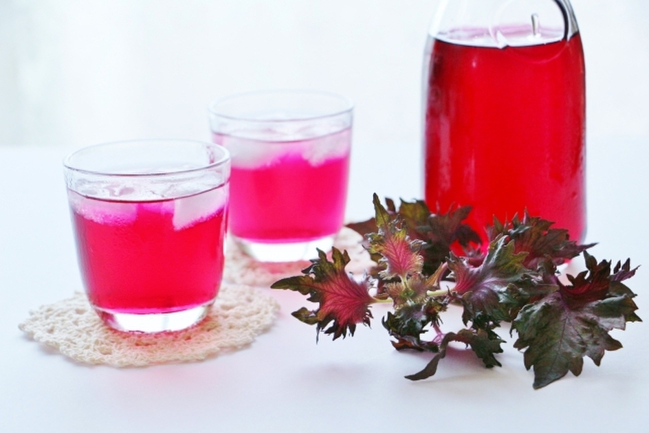 3〜4倍の水や炭酸水で割ると、赤紫蘇ジュースになります。