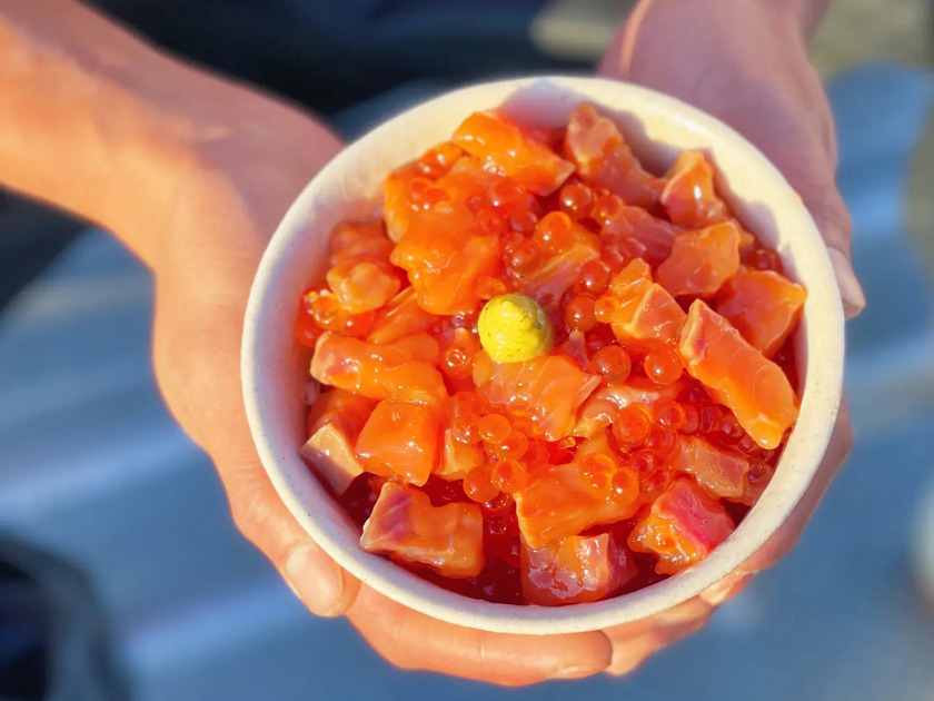 知床で獲れた新鮮なオホーツクサーモンを特製ダレで漬け込み、いくらと合わせました。