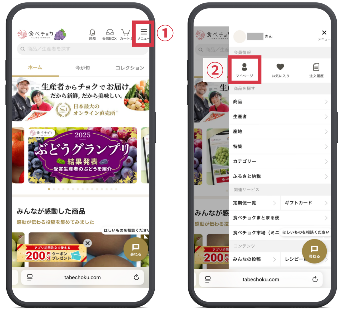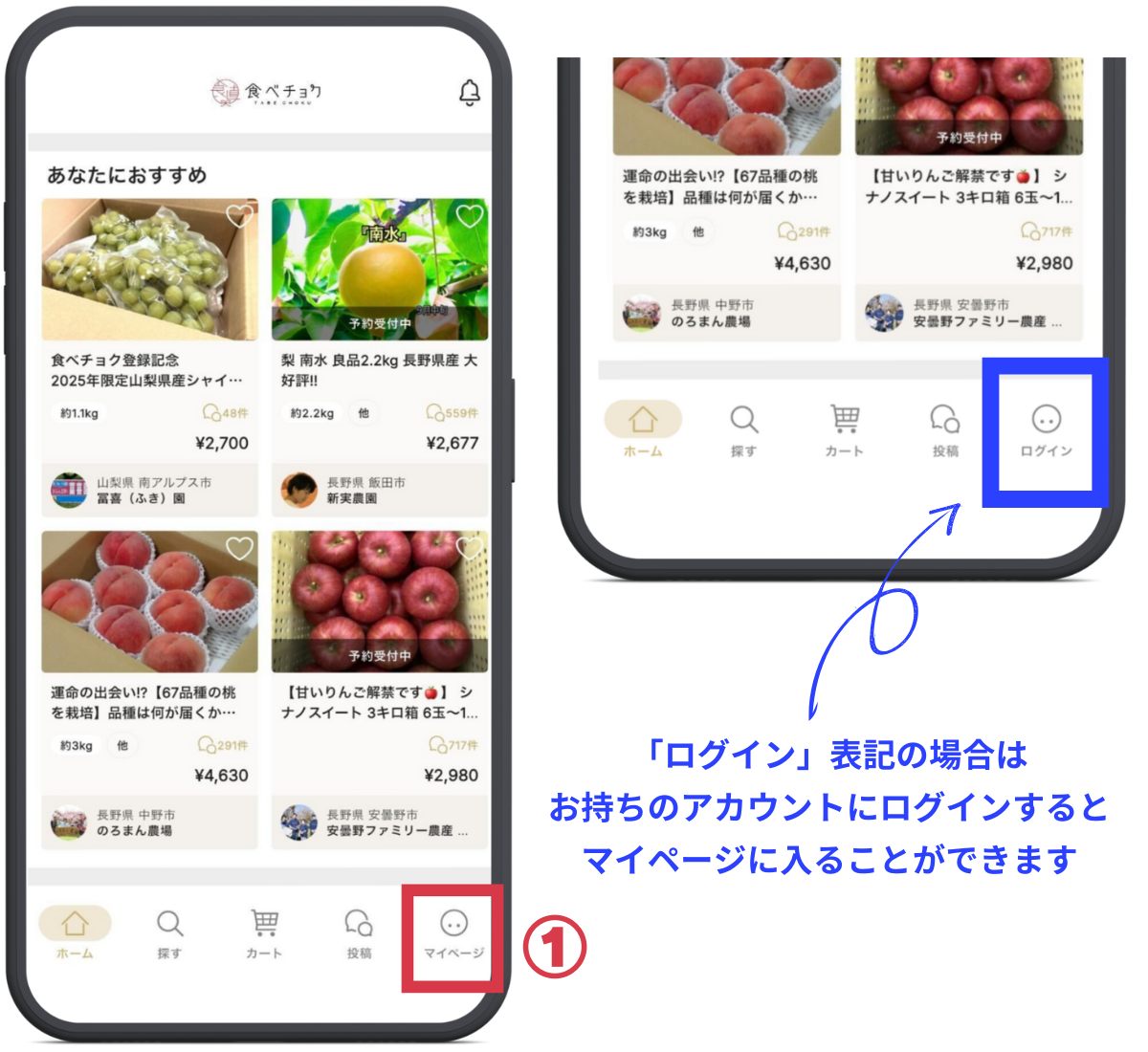 ※「ログイン」表記の場合は、お持ちの食べチョクアカウントにログインするとマイページに入ることができます