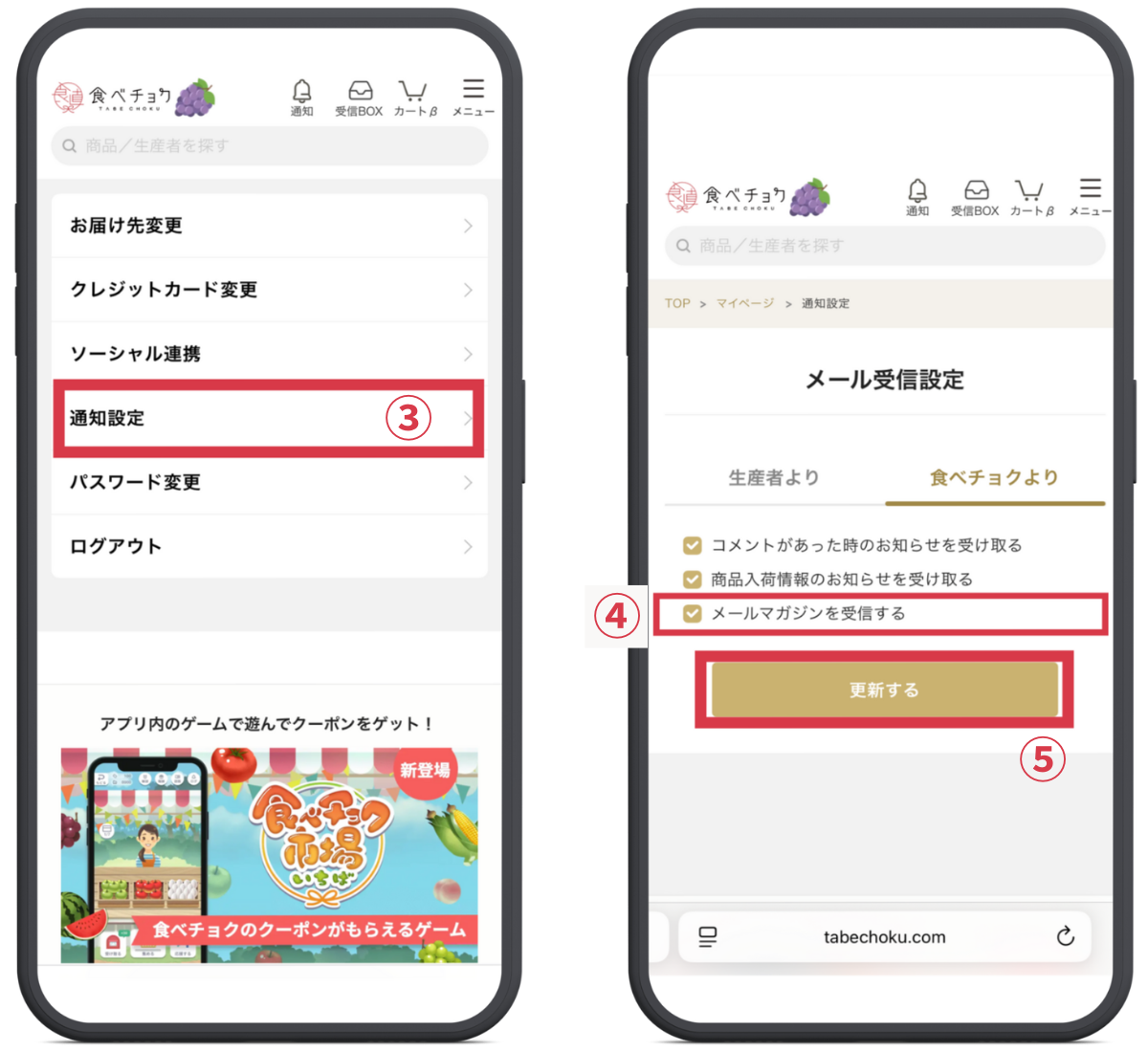 ④メール受信設定の「食べチョクより」が選ばれていることを確認し、「メールマガジンを受信する」にチェックを付けます