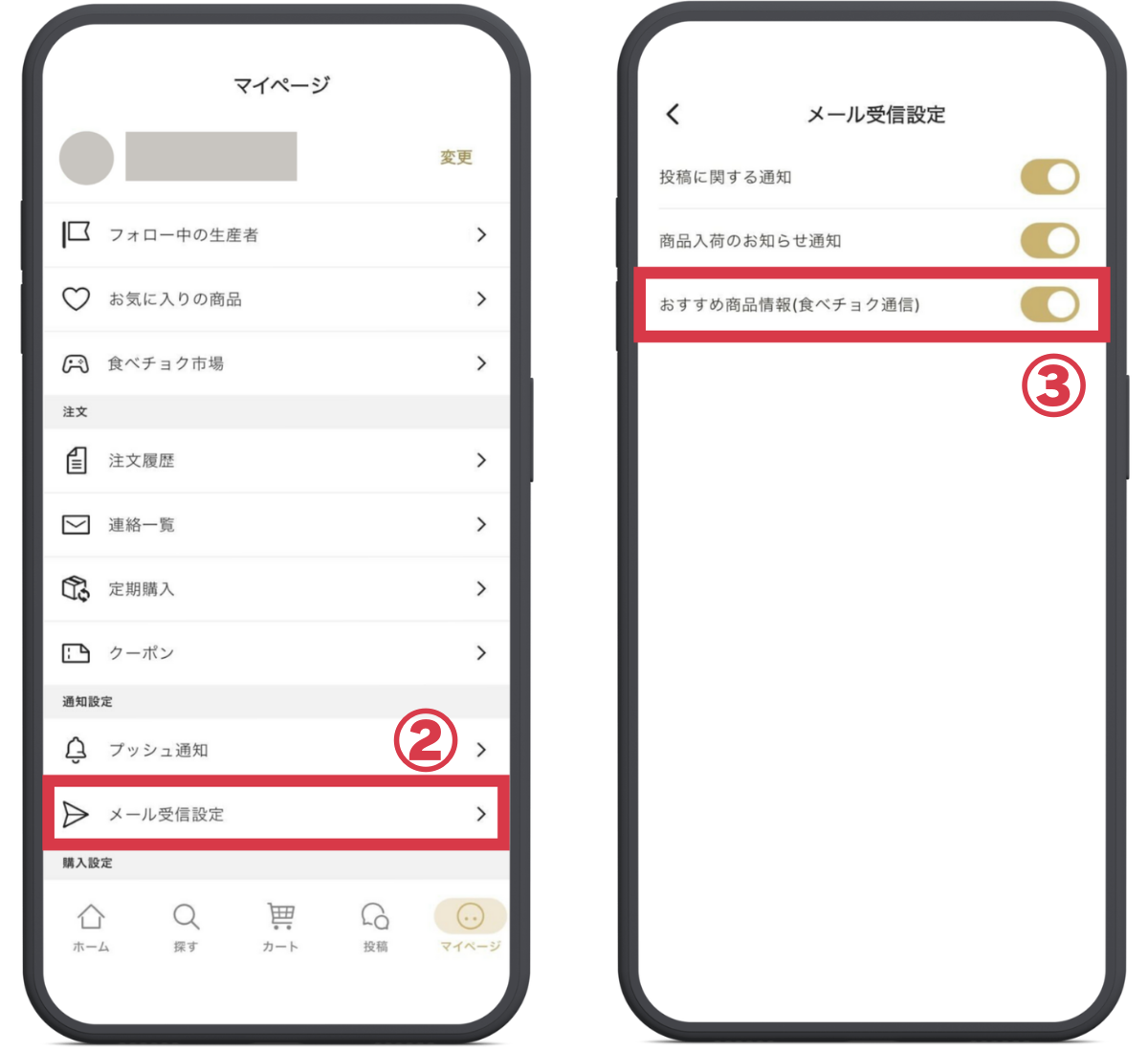 ③ 「おすすめ商品情報(食べチョク通信)」をONにすると受信設定が完了します