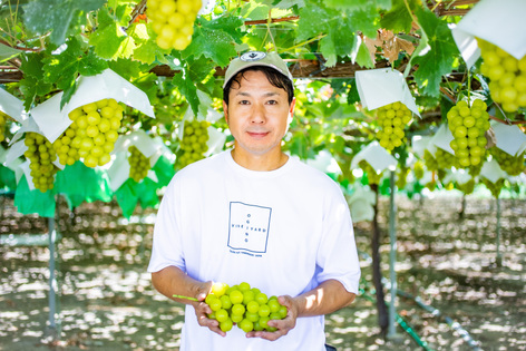皮ごと食べるとシャインマスカットの濃厚な果汁が溢れ出す。フルーツ王国・山梨県南アルプス市で温室栽培されたシャインマスカット。