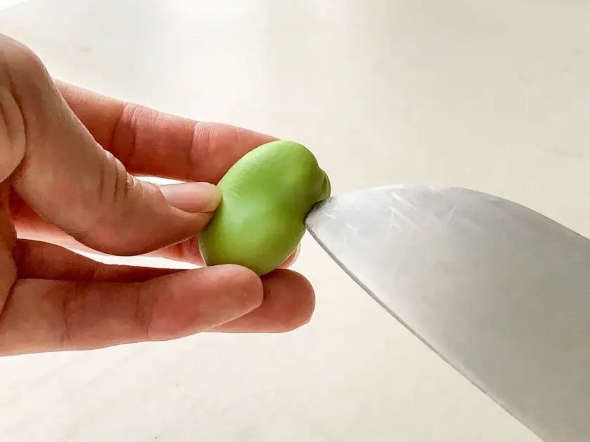 また、上記の写真のように豆のくびれ目に包丁で切り込みを入れておくと、豆のしわ防止になります。