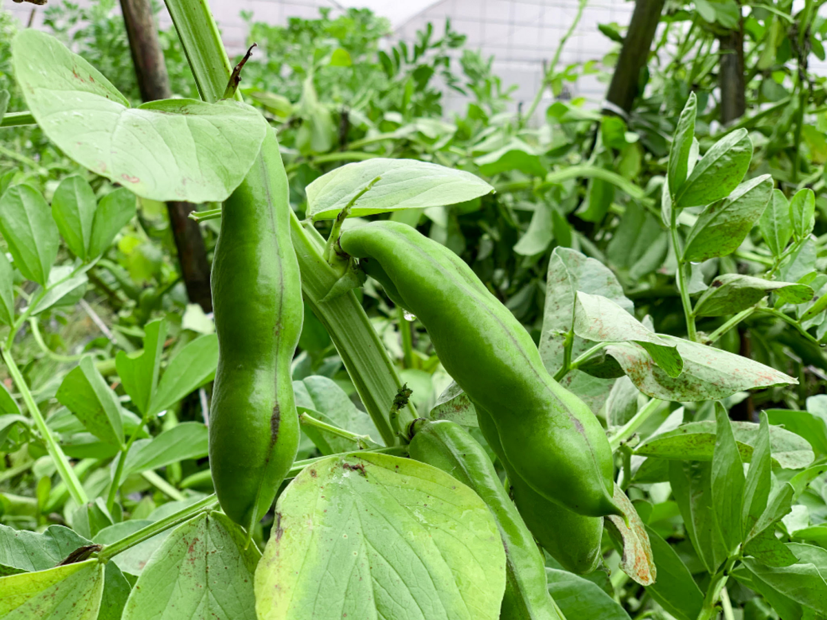 収穫のサインは、ふっくらした豆の重みでさやが下向きに垂れてきた時。実は“空豆”という名前の通り、若い時はさや先を空に向けてすくすく伸びていきます。