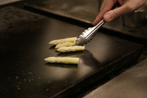 中村シェフが目の前でアスパラガスを切りながら「実はここが美味しいんですよ」と解説してくれたり、絶品のアスパラガス料理が登場したり。