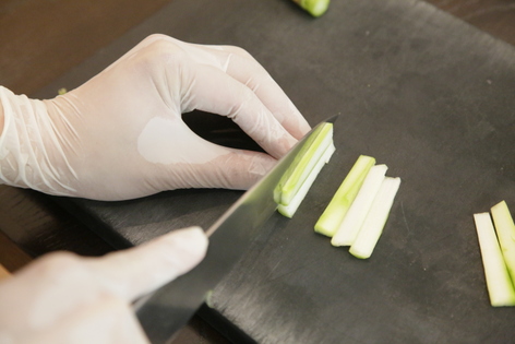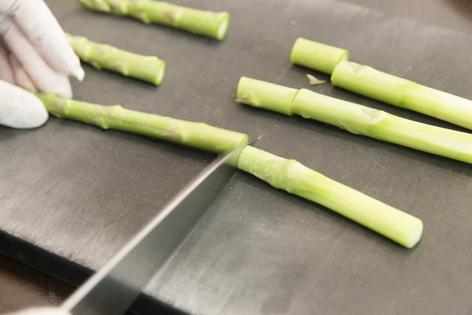 「繊維がしっかり見えるように、あえて横切りにしてみます。そうすることでアスパラガスの皮の風味がしっかり感じられますし、噛むことでその味わいがより引き立つんです。」(中村シェフ)