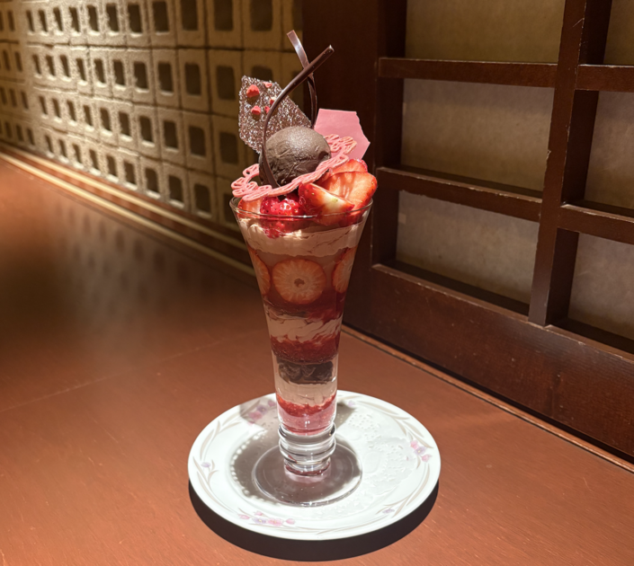 グラスいっぱいに広がる艶やかなあまりんに、まず心を奪われました。ひと口いただくと、想像を超える濃密な甘さと芳醇な香りが広がり、その後からマンジャリやルビーチョコレートのフルーティーな風味がやさしく重なります。サクサクのクランブルや繊細な飴細工の食感も心地よく、最後のひと匙まで驚きと完成度を感じる一杯。あまりんの魅力を最大限に引き出した、まさにプレミアムと呼ぶにふさわしいパフェでした。