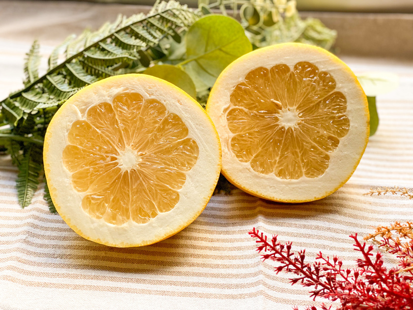 文旦とグレープフルーツを掛け合わせた品種ですが苦味が少なく、その名の通り甘み自慢の柑橘です。果汁を絞ってソーダと合わせたスウィーティーソーダや、白ワインと合わせたサングリアにおすすめです。