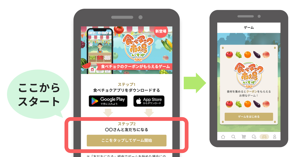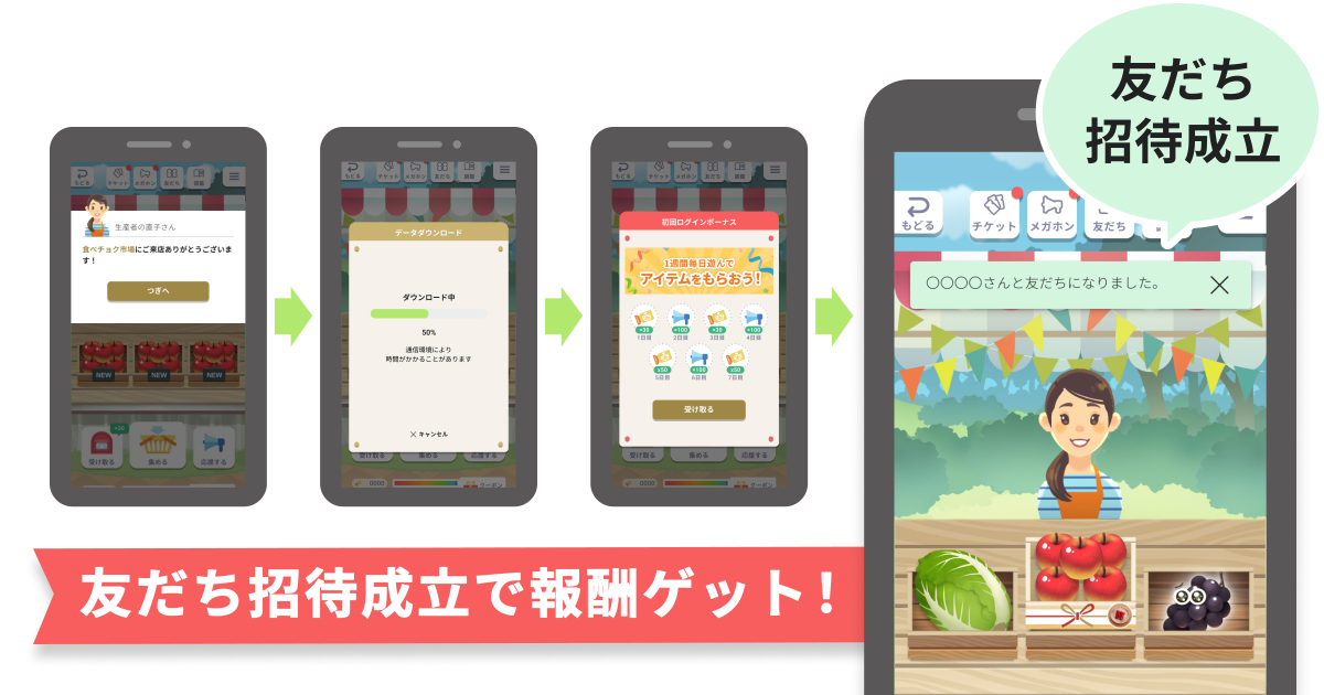 ゲーム内で友だち招待が成立する前に、招待された人が「食べチョク市場」にアクセスすると報酬を得られなくなります。招待された人は、アプリダウンロード後に下記のボタンをタップして次のステップへお進みください。
