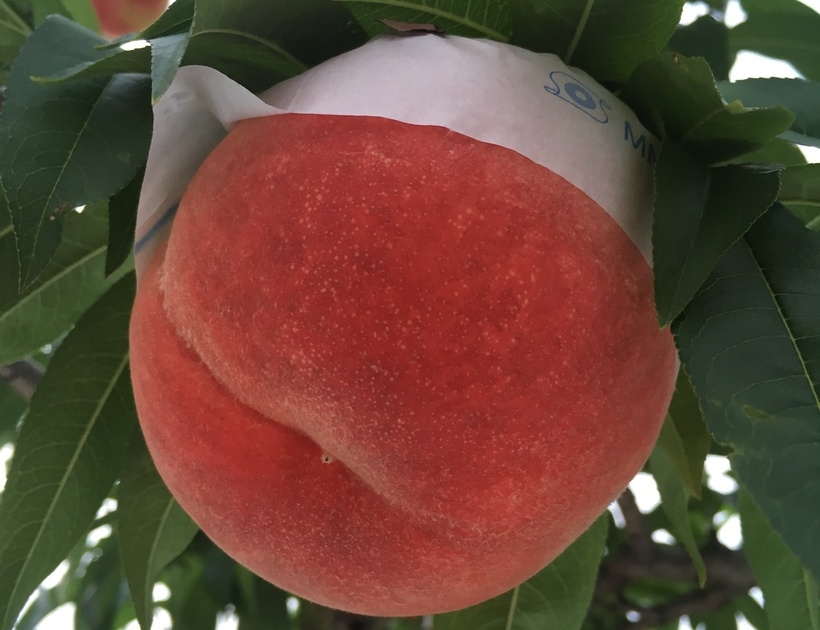 佐藤さん:「赤黒い桃は美味しい桃なんですよ、と説明してご納得していただきました。ここ10年でやっと定着してきましたね。ちなみに、あかつきとまどかも無袋で育てています。」
