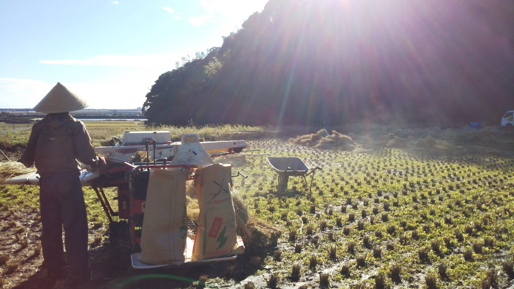 晩秋の谷津田は北東風が強くなり、ハツシモの脱穀が完了しました。ちょうど一昨日初霜がありました。2週間田んぼで追熟しました。これですべての田んぼの取り込みが完了しました。