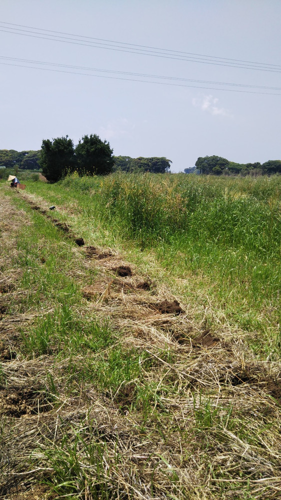 原っぱのような畑に、サトイモの種芋を埋めていきます。親芋のイモを使います。子芋よりも勢いがあり、大きく育ちます。