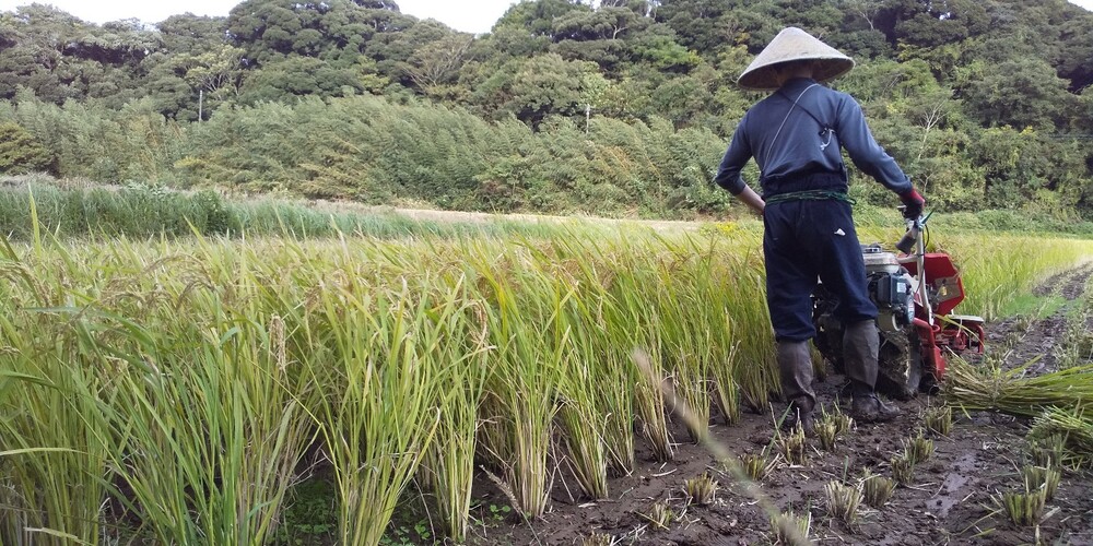 汗ばむほどの気温のなか、稲刈り始めました。イセヒカリを刈り進めます。稲束はひとつずつ運んで、竹の棹にかけてゆきます。ゆっくりと乾燥、仕上がりを待ちます。