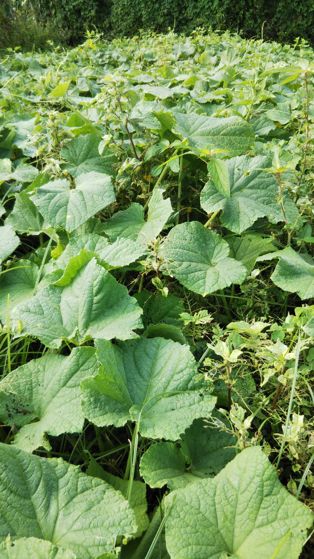 一般的にはキュウリはネットにからませ、上に伸びていきながら収穫されていきます。こちらはネットやからまるものがあれば上りますが、地面を這わせます。強風対策にもなり、ネットや支柱を立てなくとも済みます。