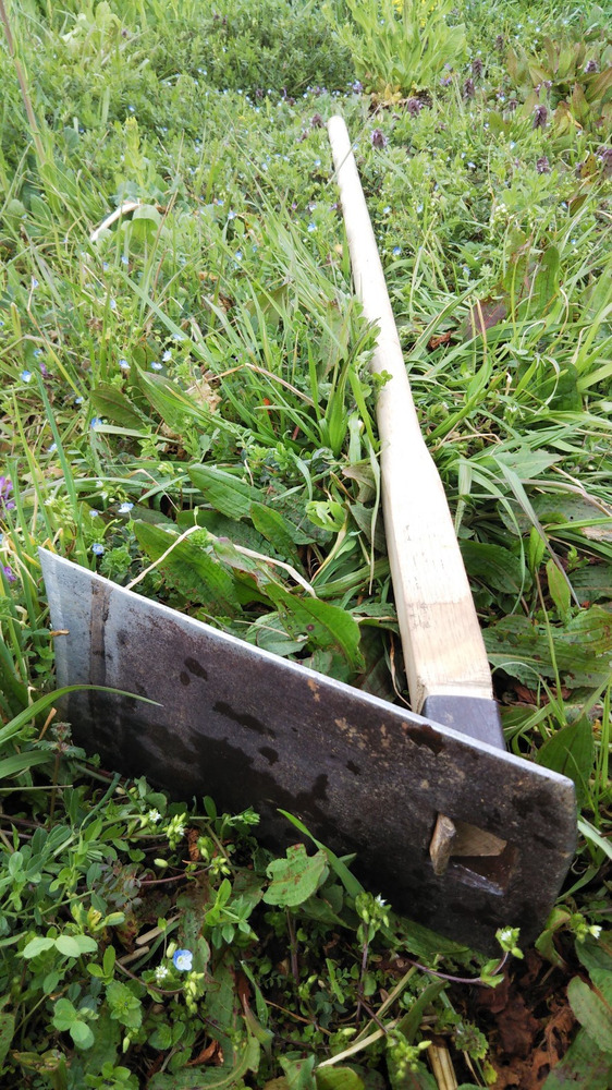 毎日の作業に使う鍬に新しい柄をつけました。やや重い柄ですが、耕さない畑にはちょうど良いです。
