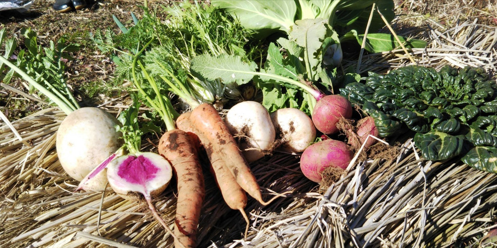 今日の中身は、ねぎ、タアーサイ、チンゲン菜、人参、サツマイモ、サトイモ、京菜、聖護院大根、蕪(寄居、岐阜紅)、紅芯大根でした。