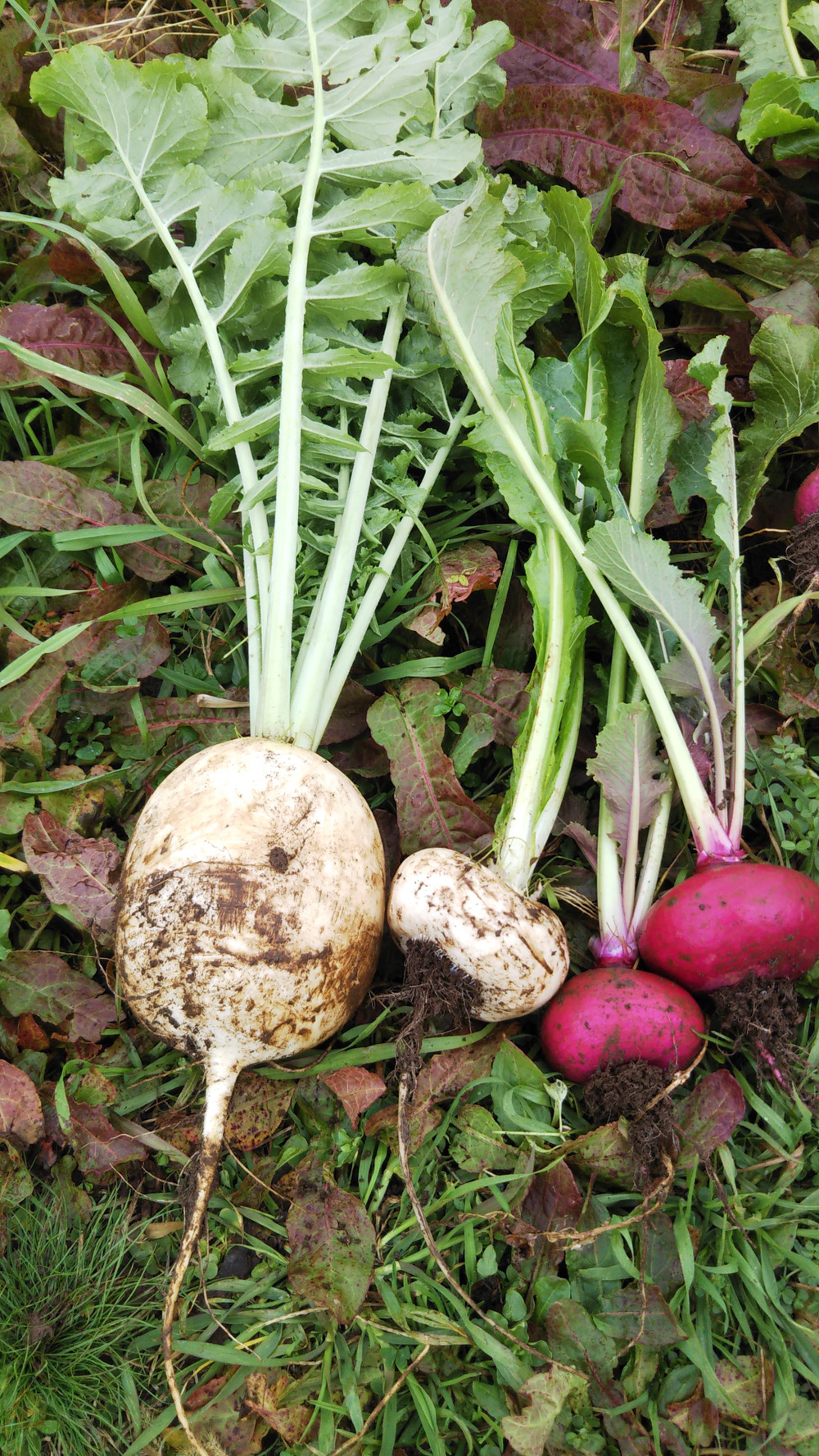 雨上がりの収穫です。聖護院大根とかぶです。自家採種の種から大根の力と畑の力のみで、育ちました。緻密なしっとりした大根です。