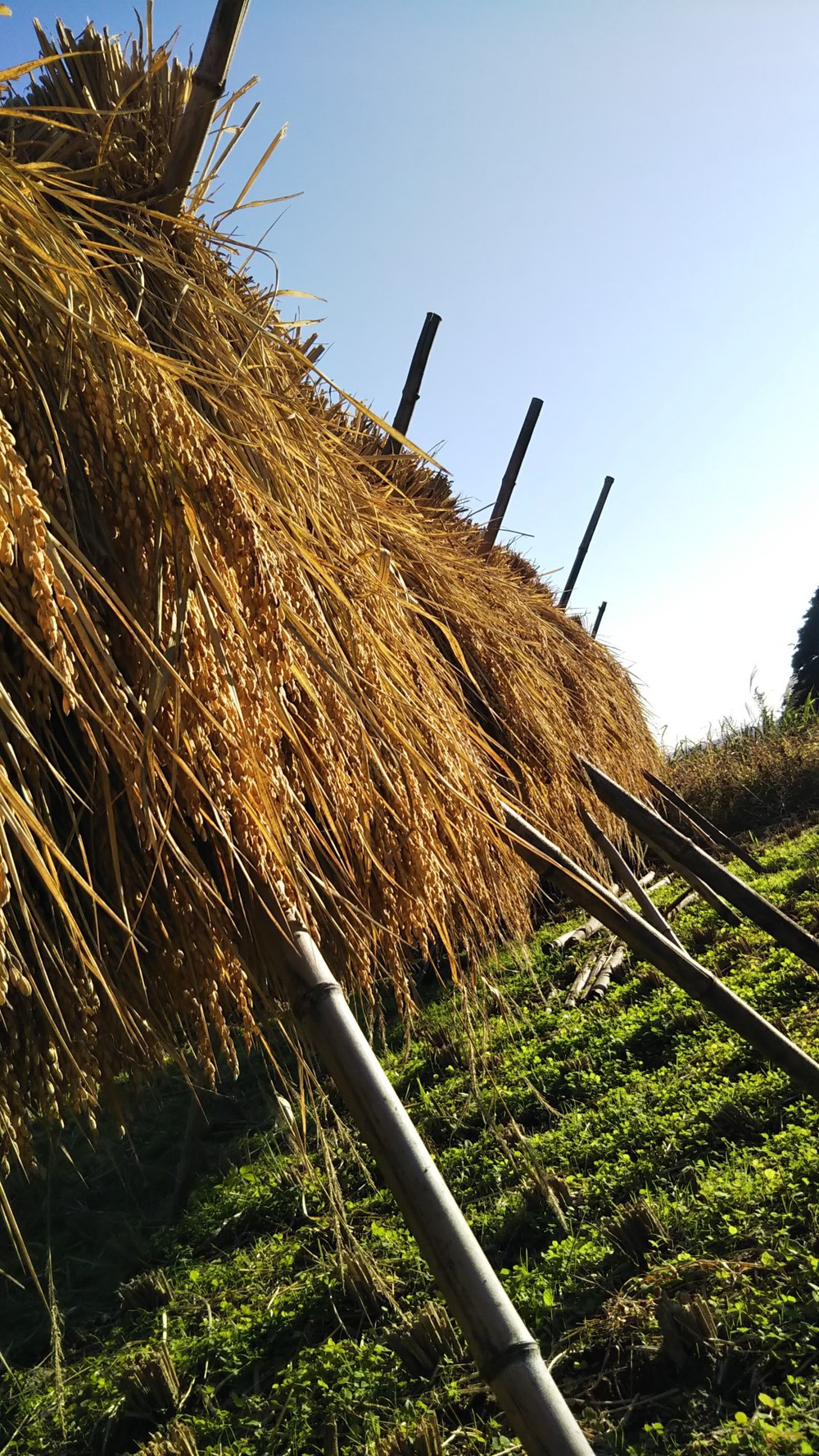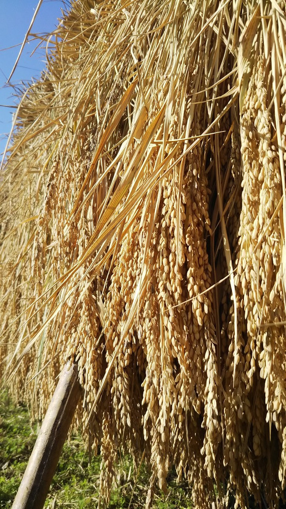 稲は刈り取られて、風と日光で乾燥、追熟が進みます。日数がかかります。その分美味しさが増します。