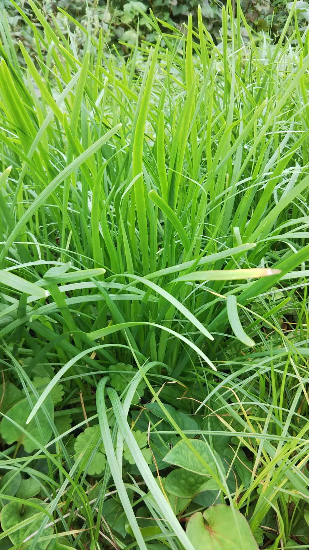 涼しく、雨が多くなり、ニラが草の中でイキイキと、青々と伸びてきました。