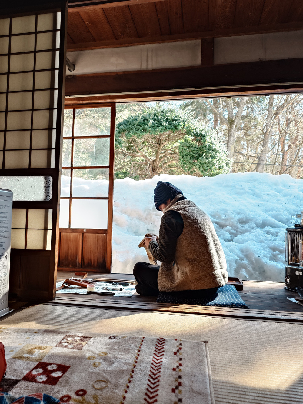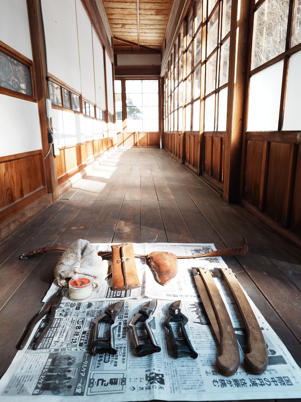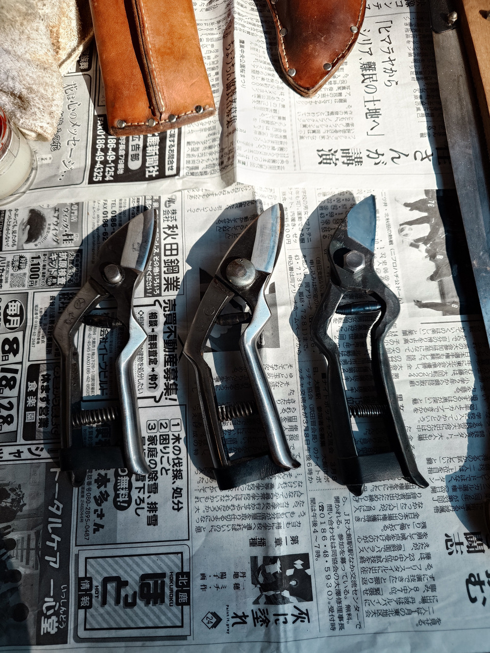 2月26日、剪定道具の手入れの様子。この日でもまだ家の前は雪の壁。雪の影響もあり、剪定作業は例年より遅れますが、今月から開始します!