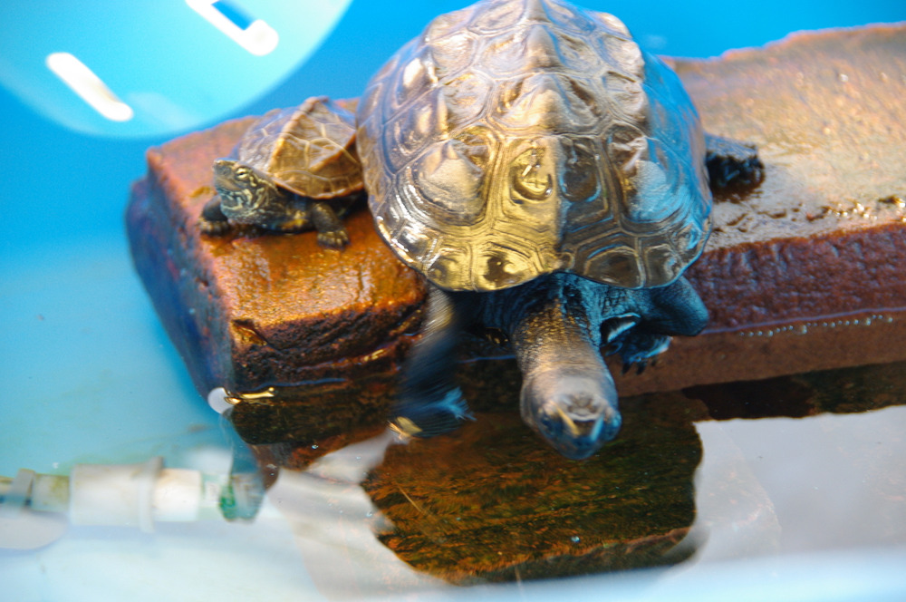 右の写真はクサガメの1号と3号ですが、実は当農場へ迎え入れた動物第1号~3号はクサガメでした。動物4号は鶏の「ボリちゃん」なのですが、カメ4号として先日甲長4cmくらいの子ガメを畑で保護しました。小さいので気付かずに危うくトラクターで耕耘してしまうところでした😅