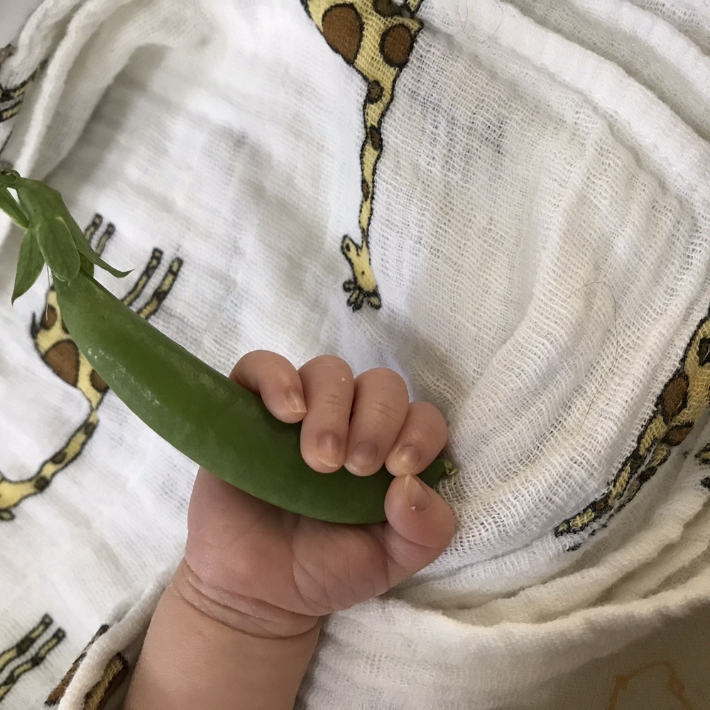 夫からの畑のお土産のスナップエンドウを持ってると、