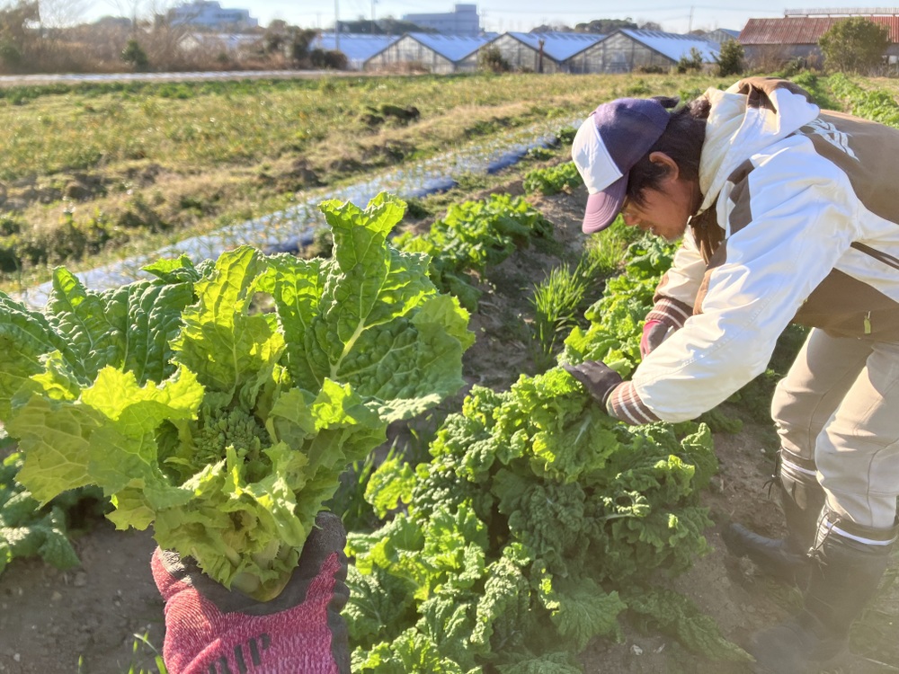 畑では例年より1ヶ月遅れで菜花の収穫が始まっています。まだちらほらしかついてない花蕾ですが、