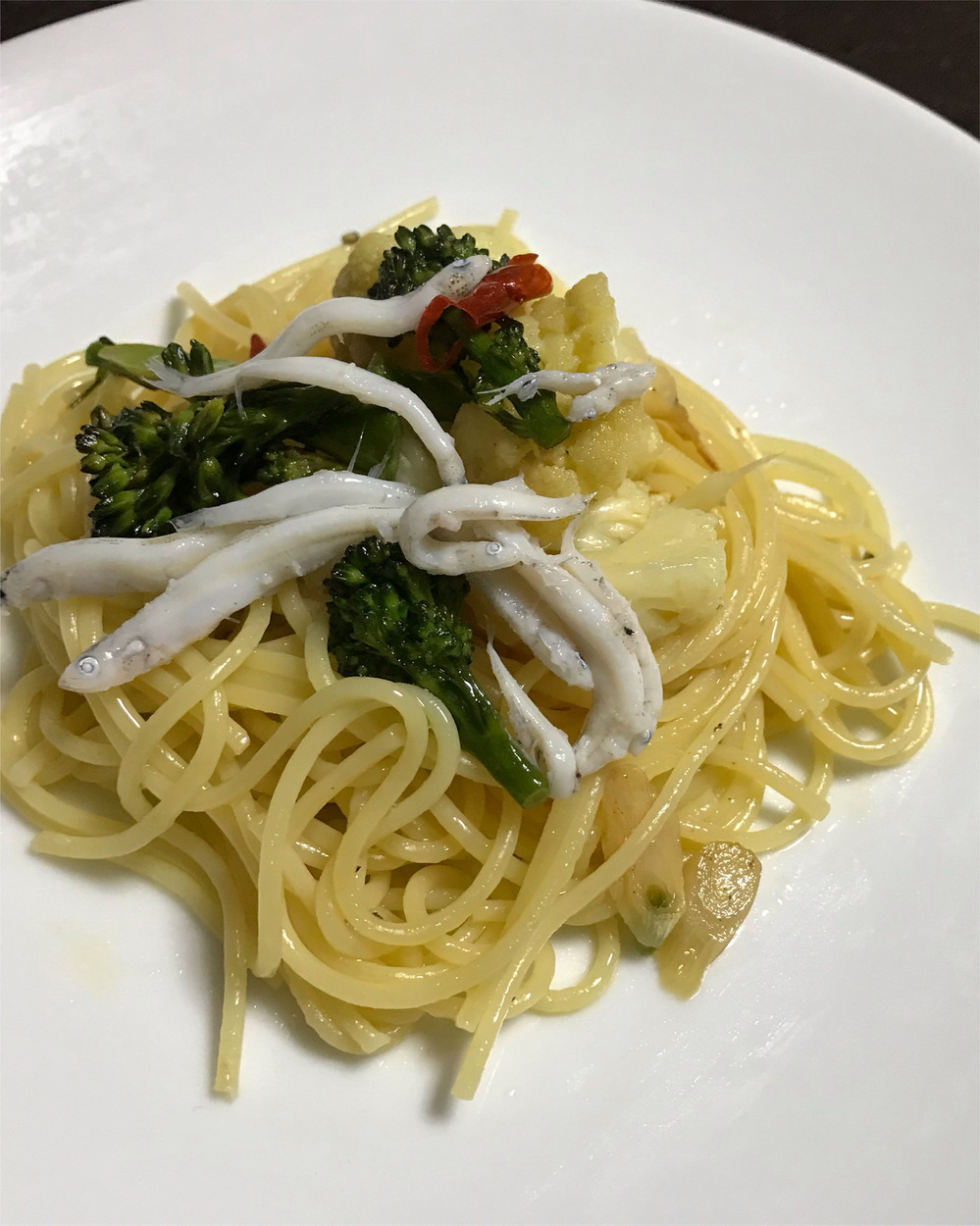 畑の片隅で育っていた小さなにんにくとで作るペペロンチーノに、