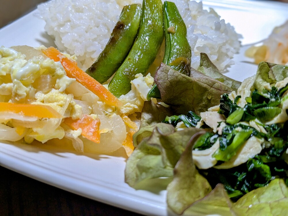 今夜の夕飯はスナップエンドウのニンニク炒め、大根・人参・新玉ネギの卵とじ、小松菜と鶏むねのゴマポン酢和え、酢の物です😋