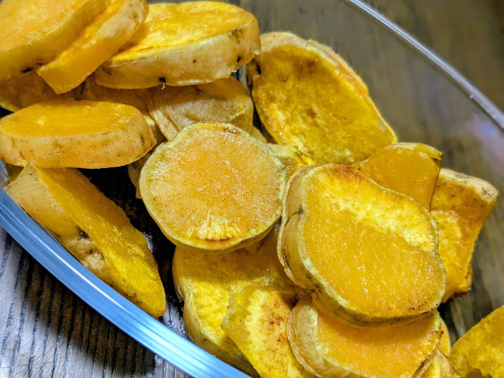 フライパン焼きはサツマイモを1センチくらいに輪切りカットして、油を引いたフライパンで弱火から中火で蓋をして裏表火が通るまで焼く調理です。
