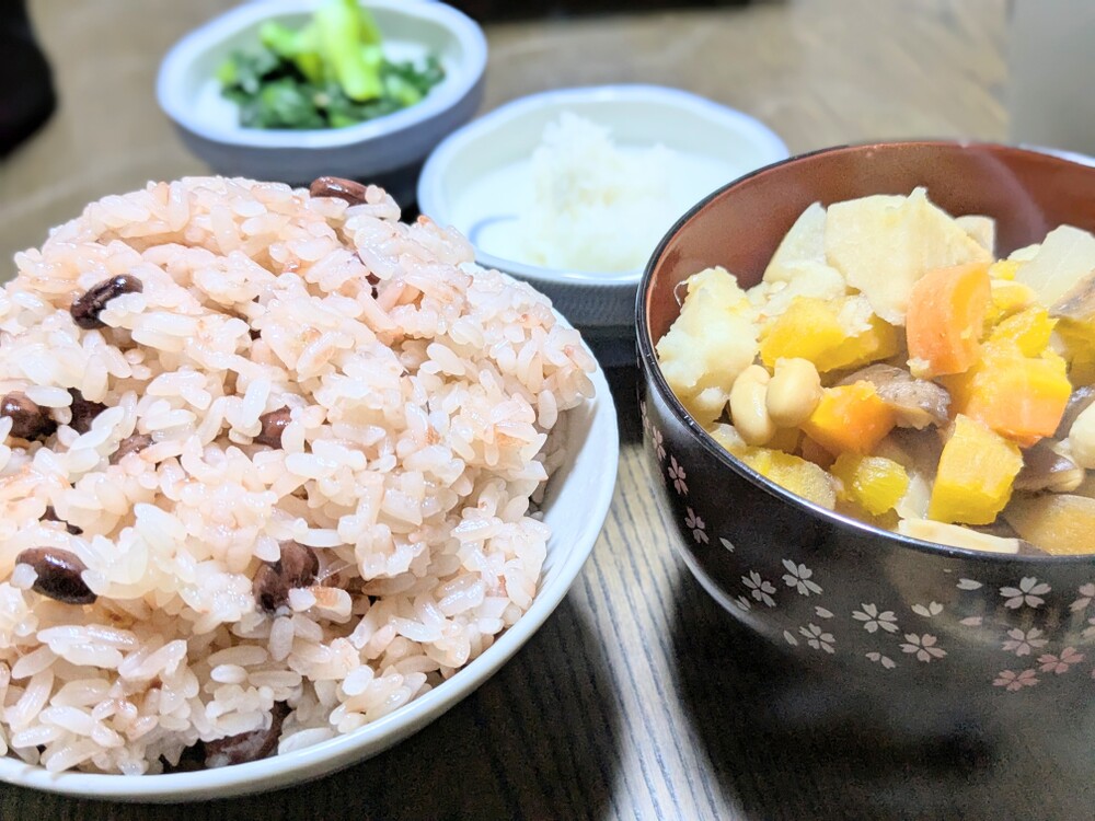 今晩は、小松菜のお浸しと水菜、わさび菜、つけなのサラダ、蒸しじゃがいも、大根おろしです😉