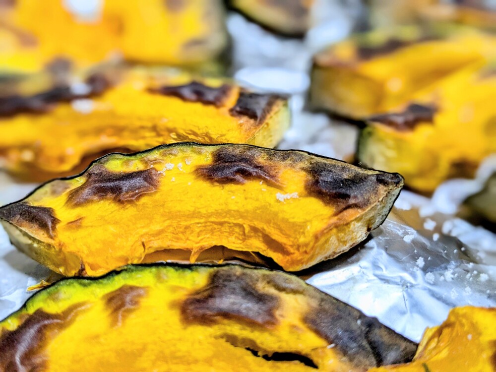 かぼちゃはスライスして魚焼きグリルで弱火焼きです🎃これもお塩パラパラ、あま〜、うま〜かぼちゃも熟成されてきて美味しさ満点になっております。