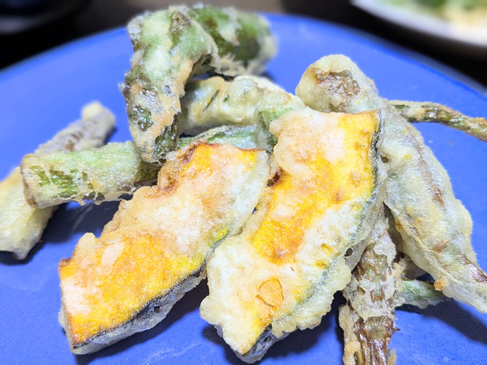 オクラとかぼちゃの天ぷら、玉ねぎと人参のかき揚げを作りました🥕(玉ねぎと人参のかき揚げは撮影忘れておりました😅)