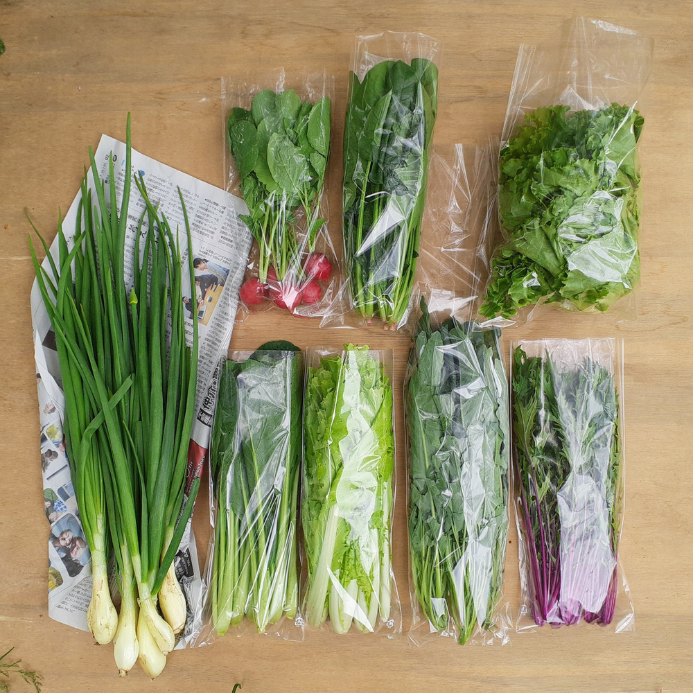 初週は小松菜、赤水菜、ラディッシュ、リーフレタス、ミニ大根、葉玉ねぎ、絹さや、ほうれん草、山東菜、などの中からお届けします。