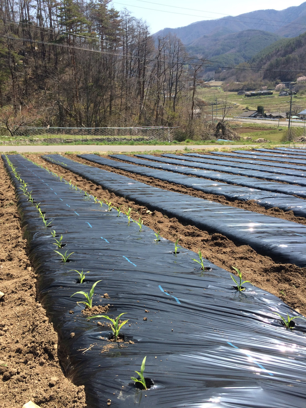 写真はトウモロコシ。まだまだ植えてない畝もこれからバンバン植えて7月には皆様のもとへあまーいプリップリなトウモロコシをお届けします。