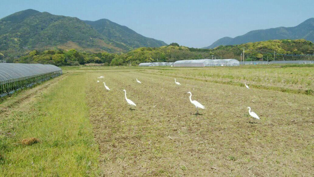 私の田んぼは、除草剤を使わず畦草刈りをして、トラクターで耕運しています。トラクターの振動でカエル(ヌマガエル)が飛び出すのをサギが狙っています。