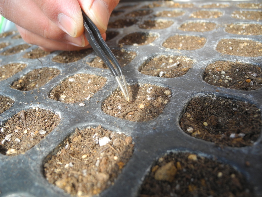 指ではつまめないくらいの1㎜程度の小さな命をピンセットで1粒1粒つまみ、時々土に混じって分からなくなりながらも無事に蒔き終えました!
