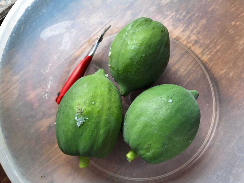 昨年から植木鉢で育てていたパパイヤを、畑に定植するのが遅れ、6月末になりました。植える木が大きくても、定植をするのが遅れると、生長にも響き、ようやく青パパイヤの果実が収穫できました。