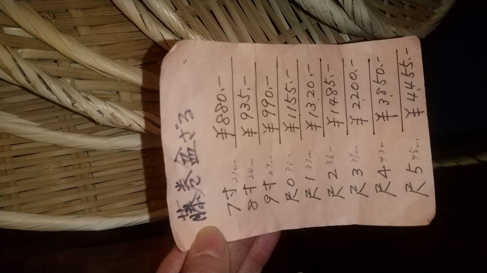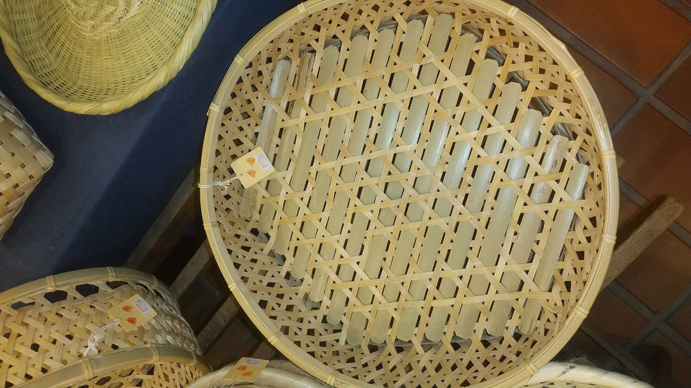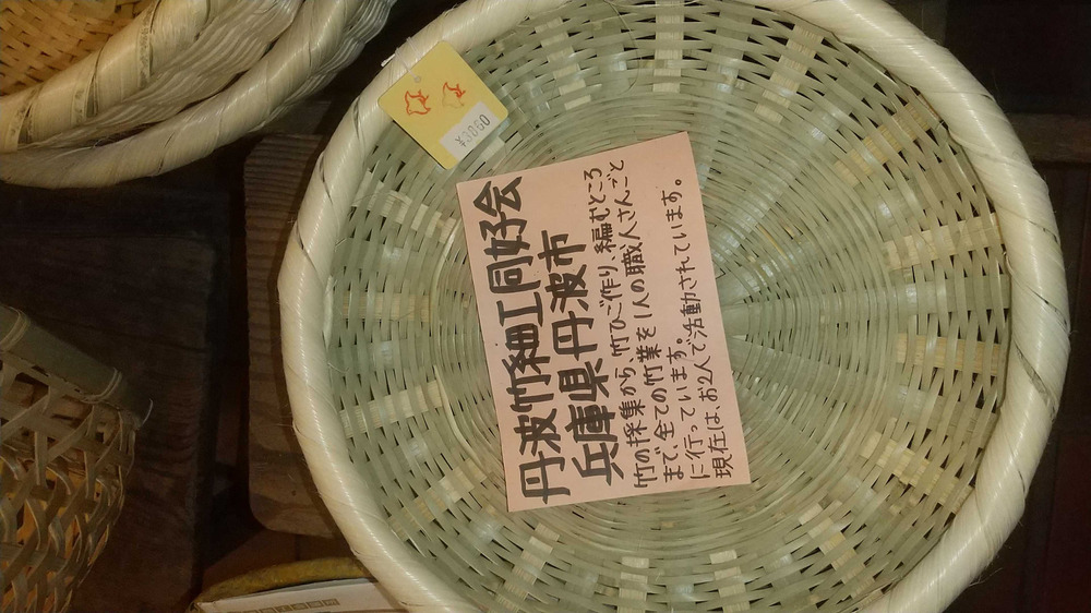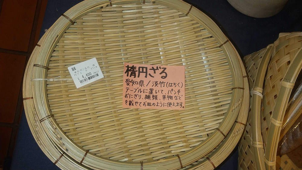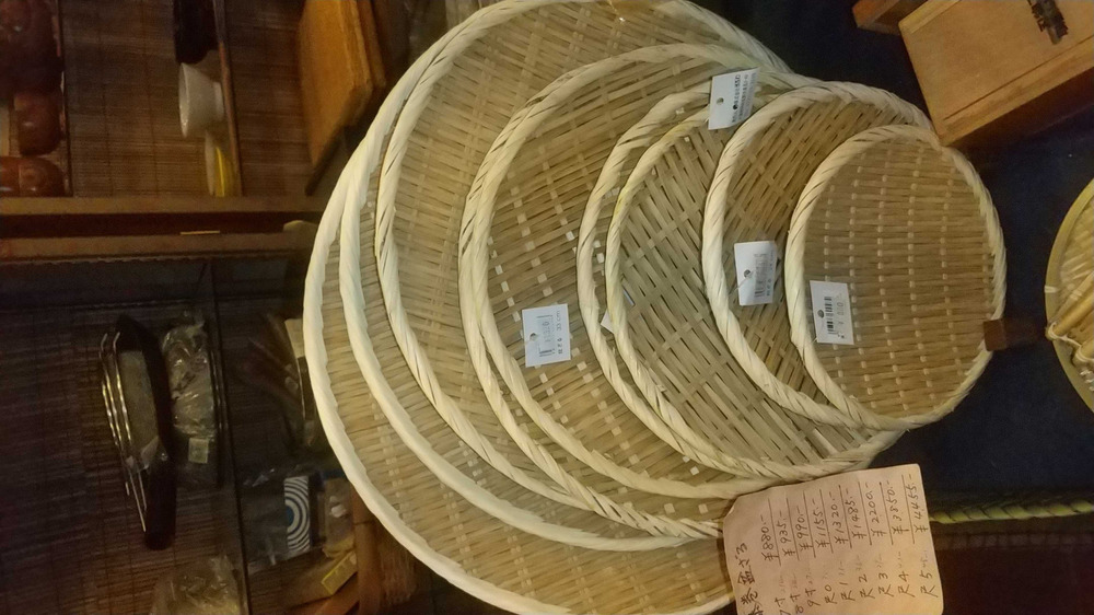 「高原誠吉商店」には、当農場で必要な「平ざる」を、しっかり見てきました。編んだざるを止めるふちには、様々な工夫がなされています。籐でしっかりぐるぐる巻いたもの、竹で挟んで、籐や針金などで止めたもの、製品ごとに異なっています。その工夫を見ているのも楽しい。