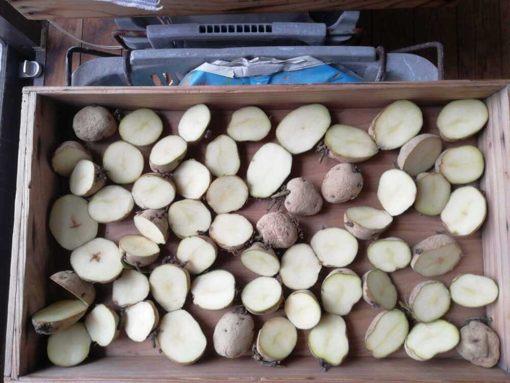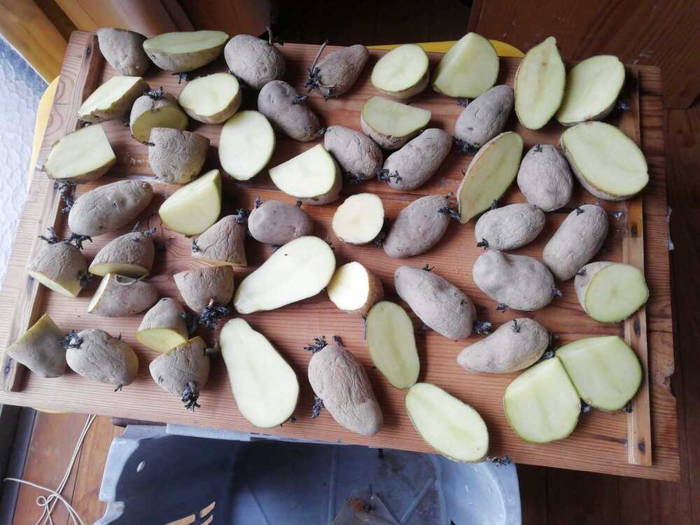 来週、種ジャガイモを植える予定なので、既に芽出しを終えている種芋のうち、大きなものを切りました。数日後に断面が乾いたら、準備完了です。