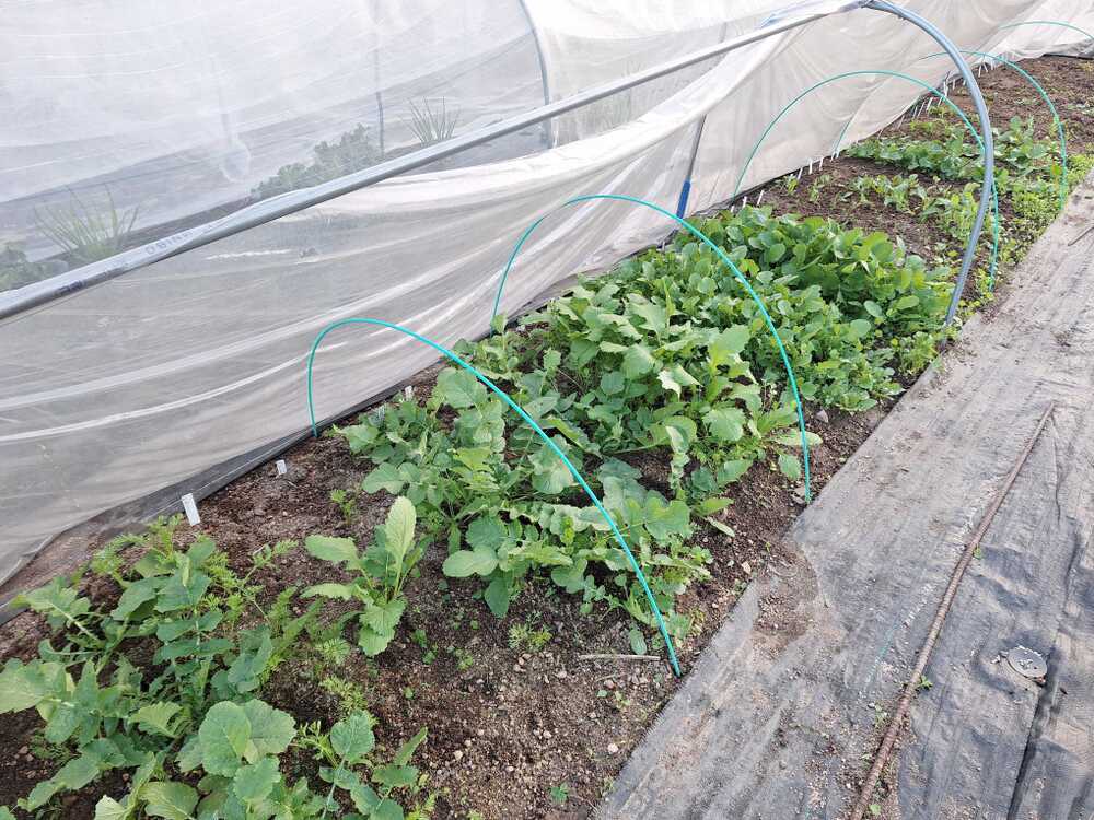 トンネルに植えたダイコンやカブ、ニンジンなどの野菜が、確実に生長しています。今年は、春先に野菜がなくならないよう、1月から毎週段蒔きにしてきました。狙いどおり、左側の生長が早く、右側に行くほど生長が遅くなっています。