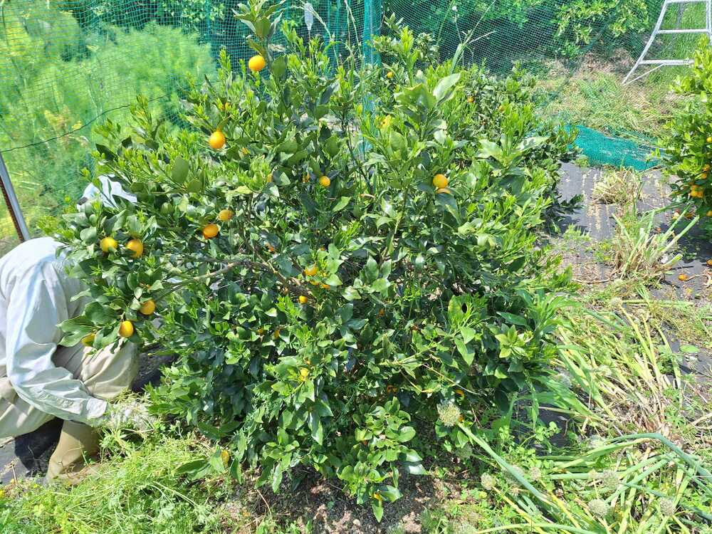 今日は、鳥に食べられないよう、防鳥ネットの中で栽培している柑橘の株元の除草をしました。種なしキンカン「ぷちまる」は、果実がかなり大きくなっています。試食してみまると、非常に美味しい。冬の寒波でかなり落果してしまい、木に残っている果実の数は少ないですが、キンカン入り野菜セットで販売できそうです。花も咲いており、今後も期待できそうです。先日、柑橘の収穫は一段落とお知らせしましたが、香酸系柑橘がまだ実を着けていることを失念していました。ありがたいことです。