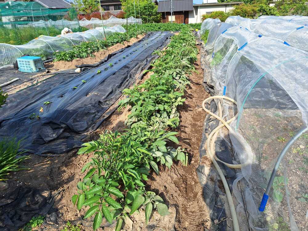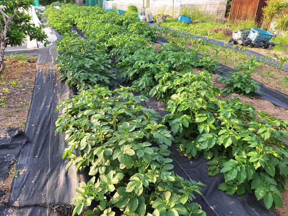先日、ジャガイモの土寄せを、やっと完了しました。雑草が生えにくいように張っている、防草シートもまだ剥がしたままです。最初に土寄せした畝は、もうすぐ探り堀りができそうです。今年は、多品種少量栽培で、それぞれの品種の収穫適期が異なるので、収穫が楽しみです。