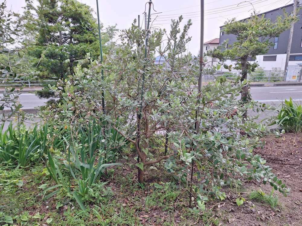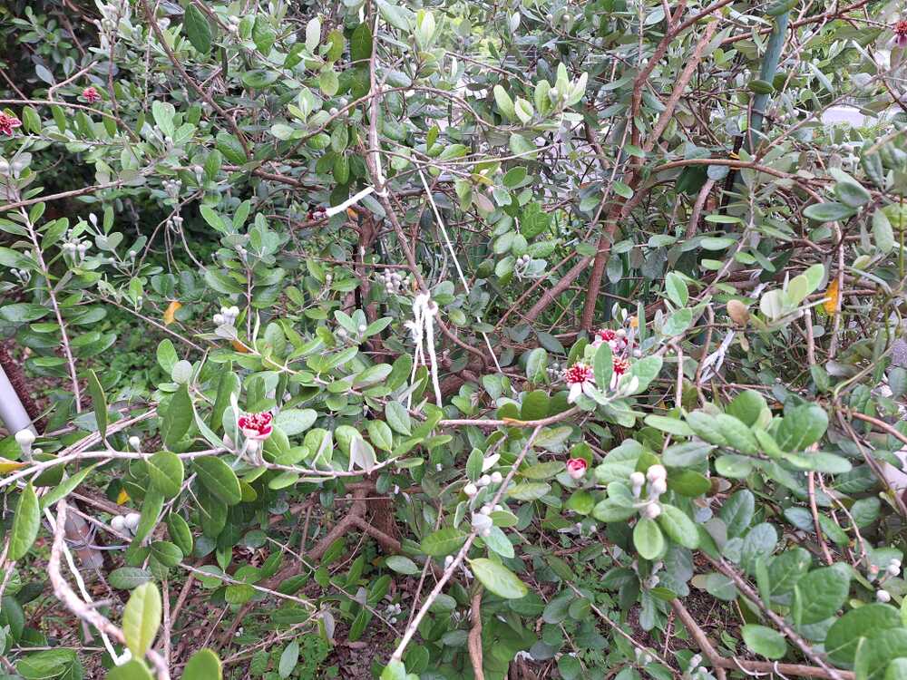 前庭にある一番小さなフェイジョアの木は、今月初めから花が咲き始めましたが、春先の寒さや少雨により、フェイジョアの2本の大木は、開花が遅れていました。この雨のおかげで、例年より10日遅れで、ようやく花が咲き始めました。この雨で、受粉がうまくいくのか心配しています。
