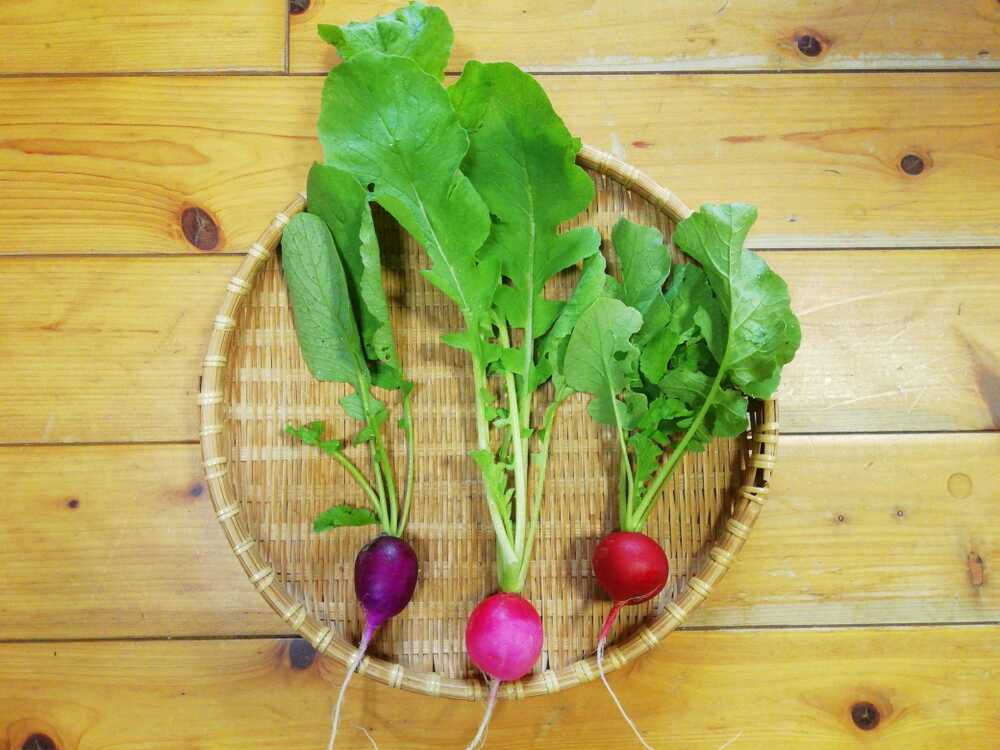 ハツカダダイコンは、短期間で収穫できる小型ダイコンです。ヨーロッパから伝来し、別名ラディッシュと言います。皮の色は赤(アントシアニン)やにもピンク、白、黄色、紫色などの色があります。形も、今回は丸ばかりですが、長丸形などいろいろあります。サラダにすると、歯ごたえがよく、びりッと辛みが楽しめます。