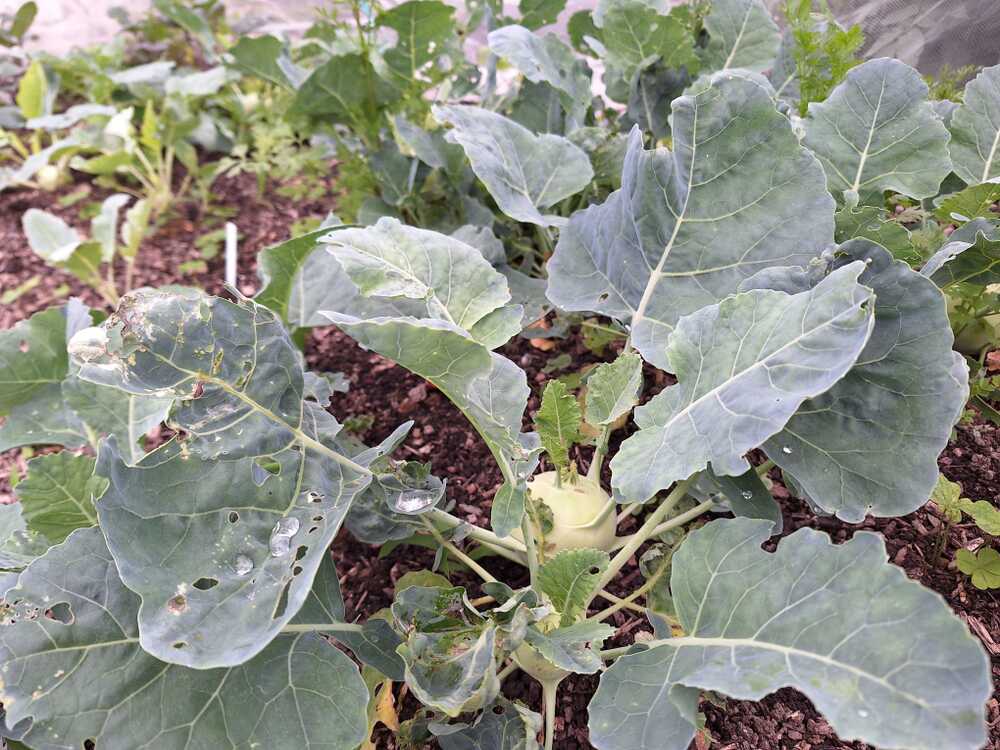 コールラビは、畑に直播にしても、うまく発芽しないこともあるので、ポットで苗を育てたものを、移植するようにしています。このコールラビが、かなり生長してきました。